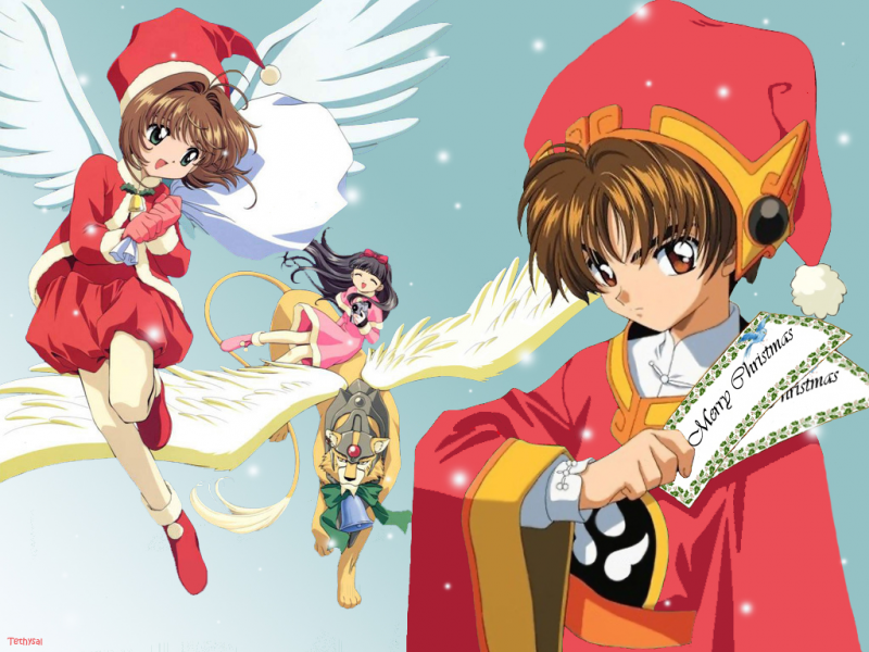 - angel, blue, card captor sakura, cherry blossom, christmas, clow, kero, kero beros, li shaolan, pink, sakura, shaolan, tomoyo