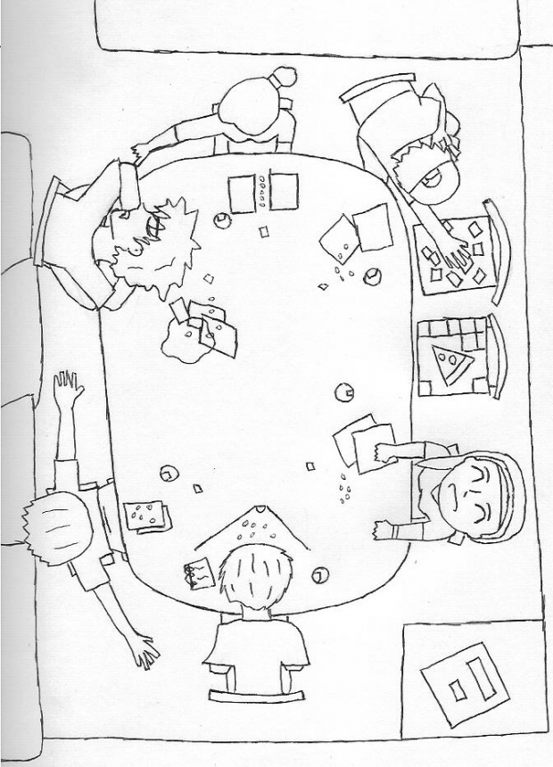 The above view is awkward, no? I thought of it one day as we were playing D&D in deathstick's basement and it turned into pure fun. ^_^ Clockwise from bottom: deathstick (banging his head on the table), the group theif (acting stoned), monkeyninja (sleeping), naruto fan42 (poking her boyfriend), zanbato (playing Magic the Gathering) and me (laughing at all the younger kids there).