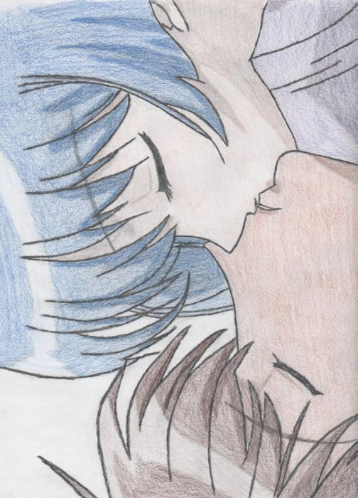 I thought this was a romantic/cute scene from Ai Yori Aoshi. This was my first time trying to pull of a kiss, and it wasn't easy! Just trying to draw Kaoru lying down was a pain! Aoi's hair was also a problem because coloring with blue is difficult. All the lines showed up, so I had to go over it a few times. I'll tell everyone now that none of my sketches are truly professional. I don't use more than one type of pencil or pen. I just use a number 2 pencil and Crayola colored pencils.