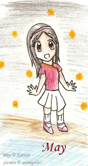 This is a random giftie for Kazusa-chan!!! XD Thanks for everything that you've done. ^o^ You're a great friend!!! XD You made me the avatar, you drew me a giftie, so I want to pay you back. Well, here's May, your O.C!! XD Hope you like it!!! XD I think the color came out better this time... ^^'' Oh, and the background was supposed to be based on the ending of KH when there's a whole bunch of the light falling from the sky. And May's by the beach of Destiny Island. Sorry, I'm not good at backgrounds... ^^'' Well, enjoy!!! XD P.S. Thanks for 300+ votes everyone!! XD I'll be working on my 300+ votes pic. soon. ^o~