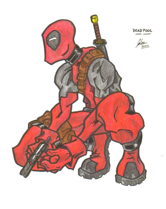There is this wicked Canadian artist on DA called Mike. He's done some wicked pieces, like the best Obito drawing ever. Anyway, he originally drew this Deadpool ninja in purple, and I have liked the image for some time, so, I re-drew it for art class and made him red.... cooler colour Mike.
