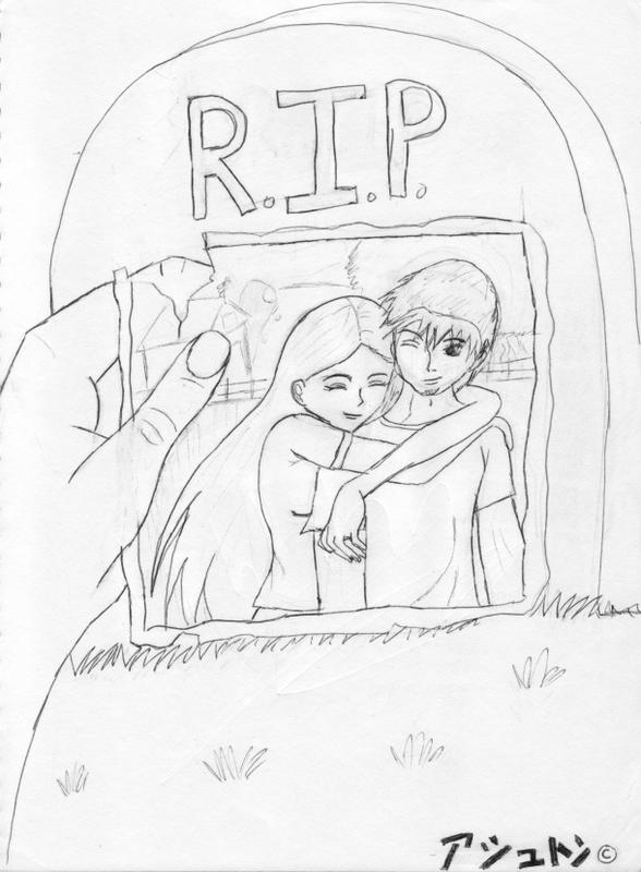 I drew this actually for a story I was writing with a friend....But like I said it was just a doodle until I decided to get fancey and add the hand and tomb stone..... my character Rai (the girl) and Will (William, the boy)were in love but... I'm not going to say who died because even though I did have someone in mind.... a lot of people I ask who was holding the pic, but I decided to let them play around with it.... ^_^ It was nicer before but I got rod of a lot of detail, thinking I could use photoshop....but it's acting dumb so I'm submitting it like this! ^_^