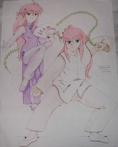 This is a character drawing to go with my YYH Beyond! fanfic that I am writting, but to say more would give away SPOILERS for my series (after I get post the part where things relating to this pic are revealed I may update these details) For now, I will just say that Here is Rose (the girl who looks like Kurama) and Kurama. My friend drew this for my YYH Beyond! series, but I colored it ^^ And it was too big to fit in any scanner, so I did my best w/ my digital camera to capture it (so with lighting and angles, the color/shading is more vibrant than it appears) You can't really tell in the photo of it, but I used a brown color scheme on Kurama and it turned out that he kind of resembles a Jedi Knight ^^; Obi-Wan-Kurama! lol