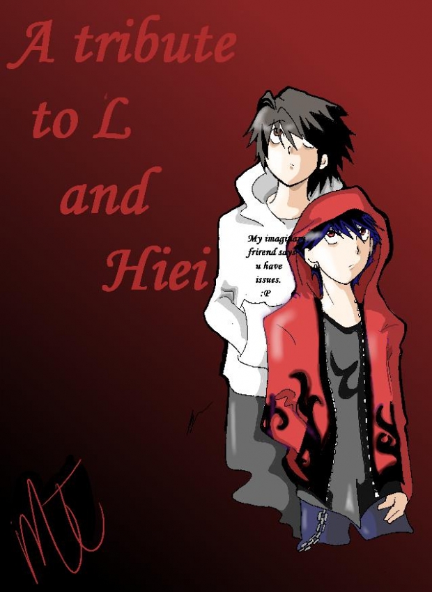 i've always wanted to draw this!! i looooove how l came out!! he looks so hugable!! and hiei (tho not my best of him) looks totally badass!!! *twirls* it took a while tho, but i like it!!! time took: sketching: eh, about 45 min inking: ...30 min coloring:God this took forever! um...bout 2 hours. i made lots o changes! pu-leez comment and vote! twink out! haseo