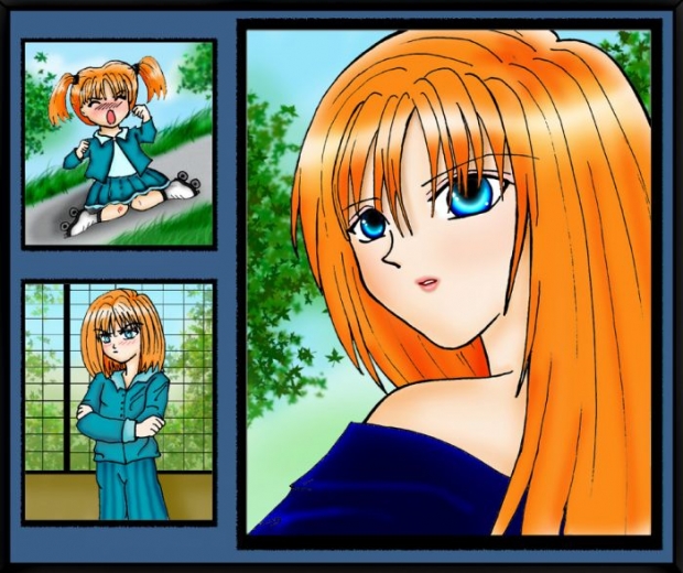 This is another entry for snow phoenix's contest. The character is Aya from Ceres: Celestial Legend. She has a stubborn side and is rash at times, and I wanted to highlight that. I tried to used lots of blues to offset the brightness of her orange hair. The pictures are tied together by the leafy backgrounds and blue clothes. Tips/criticism welcome! hand drawn, colored with photoshop