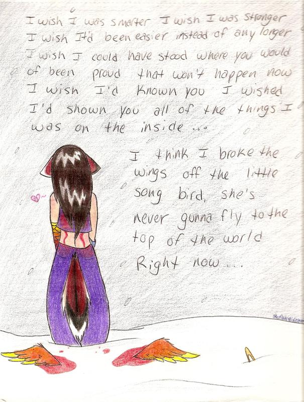 -WARNING- SOME BLOOD Song: Top Of The World Artist: Dixie Chicks Album: Home kajime human copyright to me this is human me, back facing you. ummm... not really much to explain here, picture shows all. the darned scanner didn't show the blue hightlights in the snow and the background looks black-ish when it's supposed to be more navy blue. T_T but besides that, it looks ok.