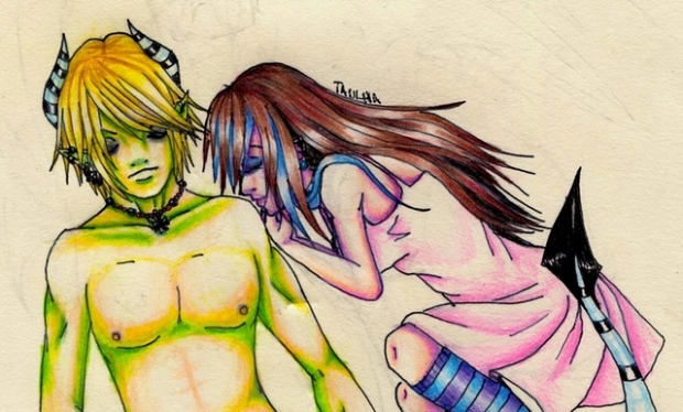 A love of a demon soul eater and a normal human girl who sees freaky crap. I don't know, these two were the basis of a story I had started. I stopped it for awhile, but I am hoping to re-start it soon. Anywho. The girl's name is Lillith and the man's name is Damien...