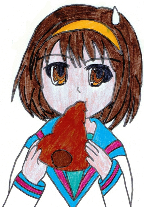 I always love how they put things of the haruhi suzumiya in lucky star like konata's cellphone. So I decided to have Haruhi face the cornet. I was going to put a background of her classroom and have it blurry so it looks like they are moving and write: Life goes on as Haruhi tries to eat the cornet.