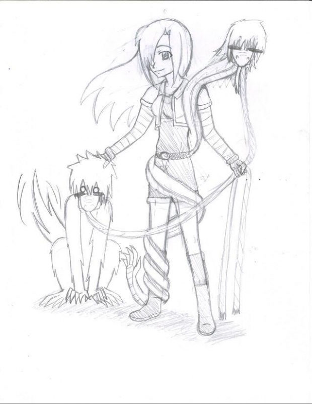 Okay, the animals are her childhood friends from when she was younger. they are like Nana as a dog. They were dieing from the same shooting event as mana's sister and so thy begged her to turn them into (what ever you call it) and so she did because they told her to. The dog looking thing is Jacob and the snake is Maria. This turned out kinda crappy. I'll re-drew a new version later..........when i feel like it XDD