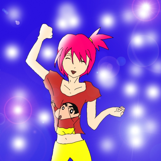 Ummm...yeah...was it the opening or ending? Well, I was listening to it and I just HAD to draw a picture of a girl dancing to it! And since it was from Shin-chan I put Shin on her shirt. I made it so she's practically wearing what he's wearing. A quick little thing on photoshop.