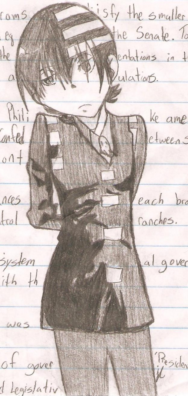 This was my very first attempt at drawing Kid-kun while i was studying for the constitution test (wich is what u see in the BG). I think it came out very well.