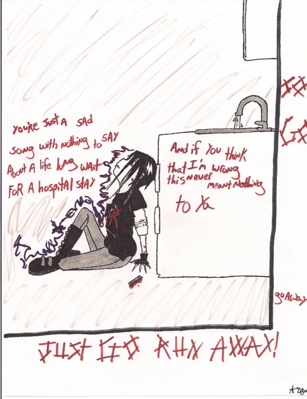 ok, just to be clear, this pic is not meant to encourage hurting yourself. actually, it's supposed to be the exact opposite (although i realize it may not look it^^') so, yeah... in other news, this is a pic i did for soloo's art challenge. the lyrics r from my chemical romance's song "disenchanted" off of their album "the black parade". it's also kind of what inspired the pic, so hope u enjoy^^
