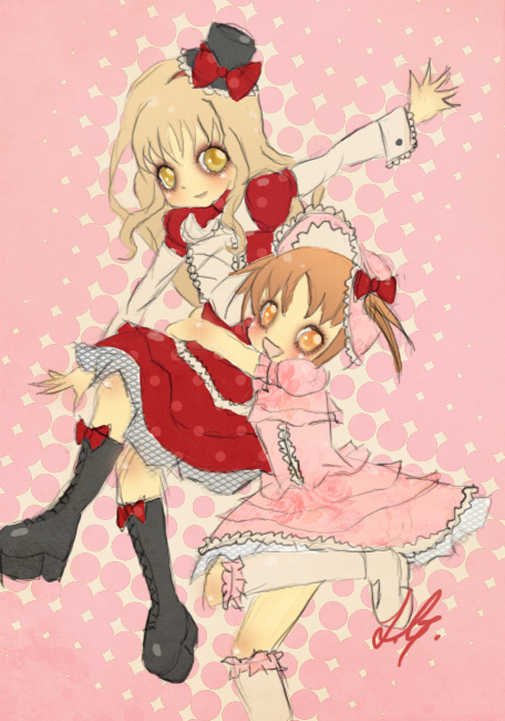 I drew Yaya as a sweet lolita with a bonnet because she strives to be cute just like a baby. I drew Rima's dress with a ring master's outfit in mind. I know Rima is more with Amu, but I think Rima and Yaya kind of look cute together.