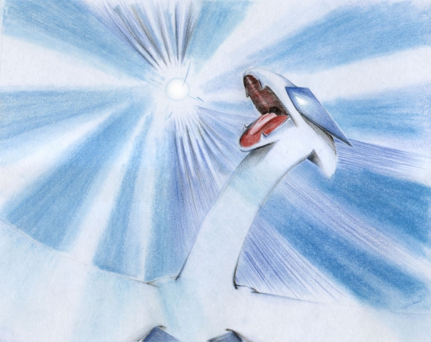 - aeroblast, attack, bird, detail, legendary, lugia, pencil colours, pokemon, silver, soft pastels, soul