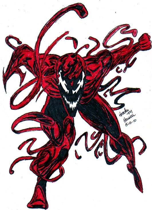 Carnage! By request! So this position that he's in is a mega bitch to draw lol.... and I'm kinda pleased the way it came out, some of the features like his leg on the left kinda looks funny but that's due to the stuff coming off him. Overall it took me two and half hours to draw. :D