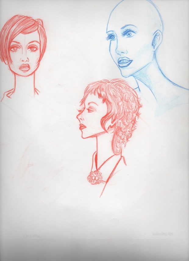 Three faces drawn with different col erase pencils. The blue and middle one would have to be my favorite. Done for practice, no real reason or story behind them. Used references from a hair magazine that happened to be lying around.