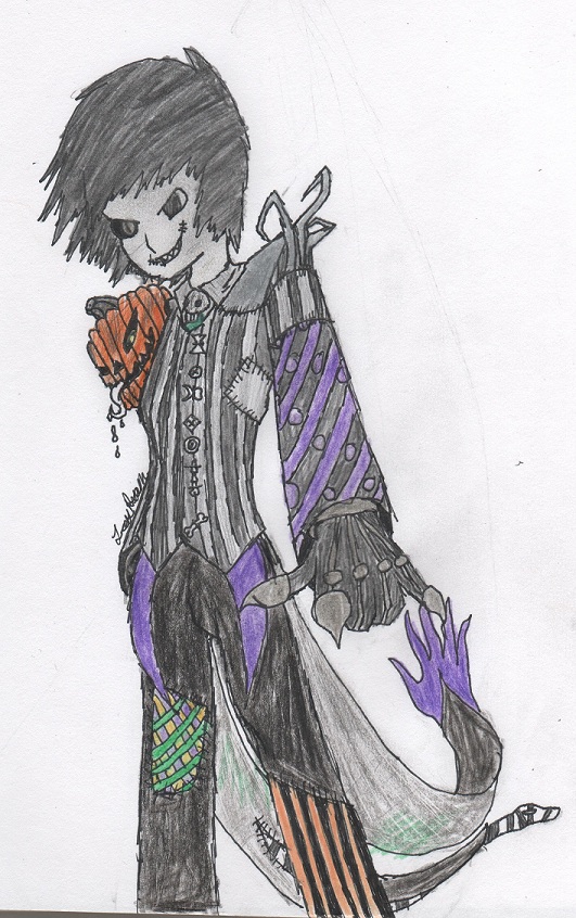 Well here's Saito in a good old Halloween Town getup. I was mainly going for a somewhat twisted, mixed up style, asymmetrical. A good Halloween background may have actually dulled the picture since most of the colors of the outfit are dark anyway, making the picture a big black mass and since the outfit is the star of this show, it might as well have the spotlight =p Also his colors may look a little messy or dirty, I was doing that on purpose though. Kind of trying to pull in that gritty, rusted over look that was so awesome in Nightmare Before Christmas.