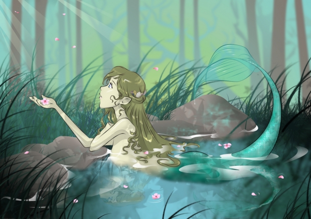 - cherry blossoms, forest, lagoon, mermaid, sakura
