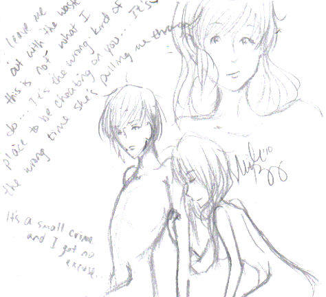 I was listening to Damien Rice's song "9 Crimes". This is the picture I was inspired to draw. The words are the lyrics "Leave me out with the waste this is not what I do it's the wrong kind of place to be cheating on you It's the wrong time she's pulling me through. It's a small crime and I got no excuse." I'm a die-hard TRUEBLOOD fan, and it's the show that introduced the song to me. It's pencil, and it's sketchy, and I like it. Feedback, please :)?