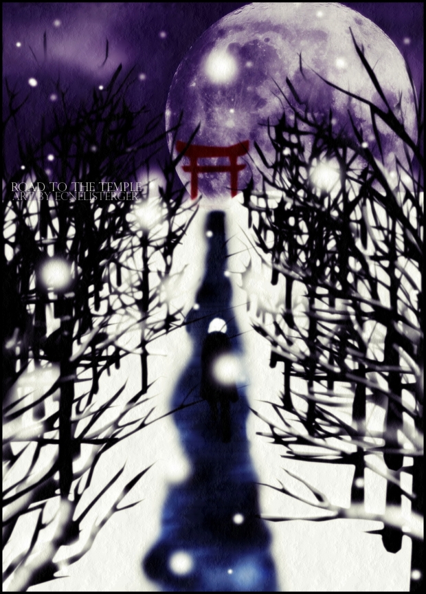 - blue, moon, night, road, road to the temple, sky, snow, stair, temple, torri, trees, winter