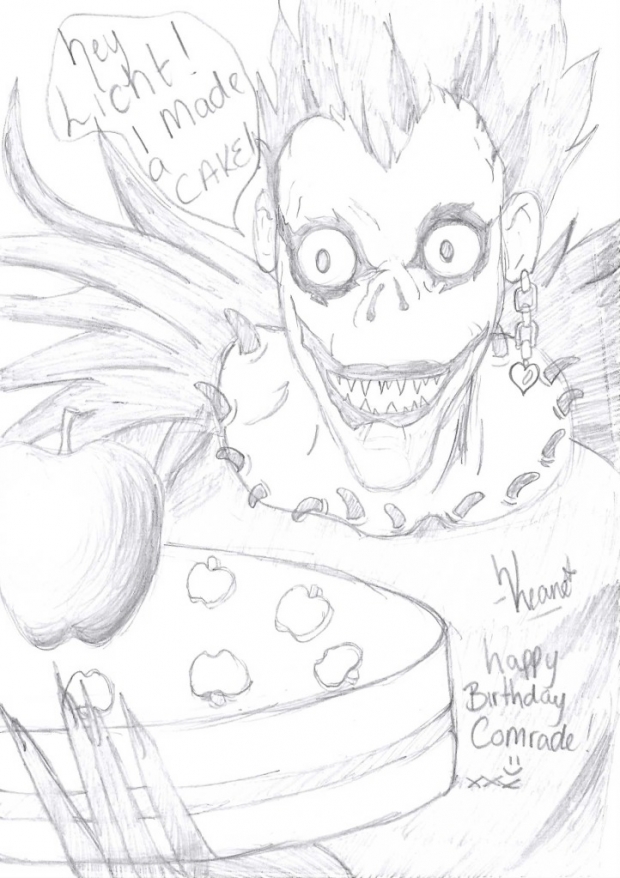 :3 Happy Late Birthday :3 i had to draw you something x_e i promised :3 when i make friends with people i PROMISE to draw something for their birthdays :3 and xmas :3 plus you drew me that amazing african wild dog ^^ :D Enjoy (my scanner makes the lighter lines vanish x_x sorry) yeah Ryuks head went wonky x_x
