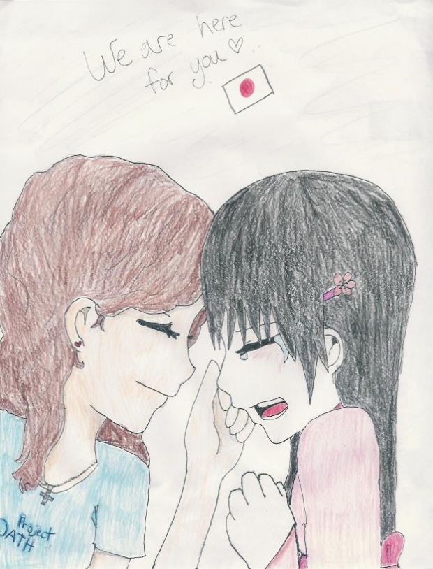 I wanted to draw something for Japan...and Project OATH. SO I got this image of comforting someone from Japan...This is me comforting a young Japanese girl. I'm wearing a Project OATH shirt.<3