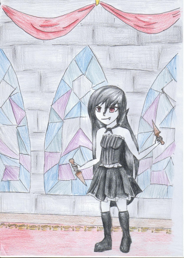 She is currently nameless... And she doesn't have much on the lines of personality. But I draw her a lot, so yeah. I like how she carries wooden stakes despite the fact that she is a vampire ^.^.