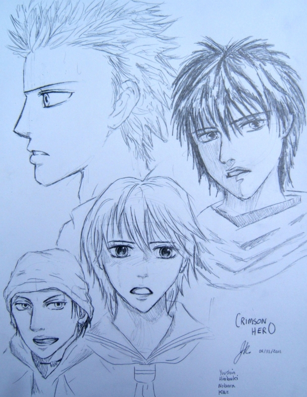 A quick sketch I did of the main characters from volleyball/romance shojo manga 'Crimson Hero'. Yushin at top left, Haibuki on top right, main girl Nobara in the center, and Kaz my fav on the bottom left. Enjoy!