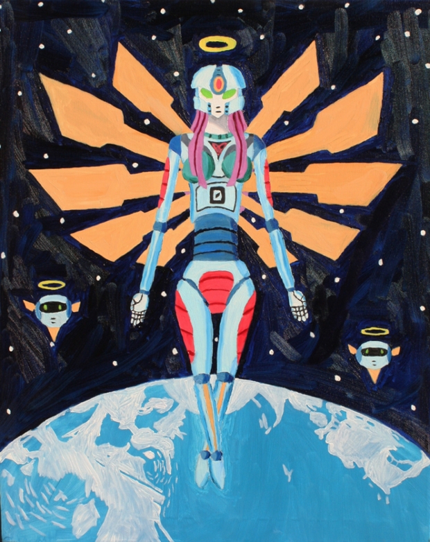 Well, here’s the painting of Angel 0, the android who’s sketch I posted a while ago. As I mentioned before, Angel 0 is an android designed to correct the environmental damage done to the Earth, but she comes to the conclusion that the human race has to be destroyed to prevent further damage. As you can see, I have her high above the Earth. Flying next to her are two of her “Angel Probes,” whose function I never really defined. I just thought the painting needed them. I’m pretty pleased with how it turned out, but there are a few things I might change if I could. For one thing, I might have gone with different colors. I’m not always good at choosing the right colors to use. One thing that my instructor and one or two of my classmates brought up was that the wings could’ve had more detail. She’s an android, so basically did them like plane wings, but maybe I could’ve done more with them, I don’t know. The other thing that concerns me, and this is me second guessing if I did a good job, is that one of my fellow students didn’t seem to see that it was a female android. This made me doubt that I did a good job in drawing a female android. Still, this painting turned out pretty well. Enjoy.