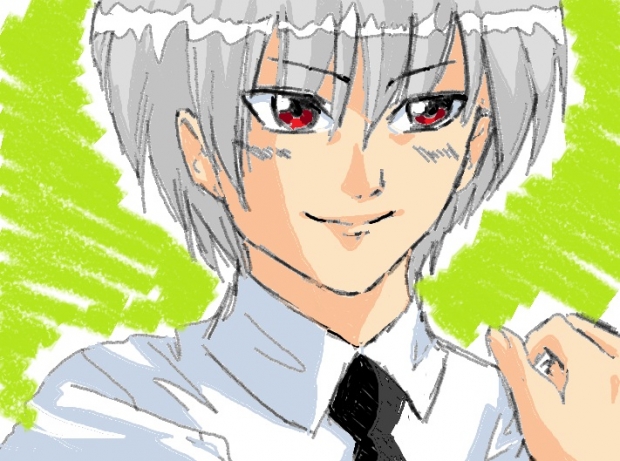 - gray hair, green, male, red eyes, simple background, smile