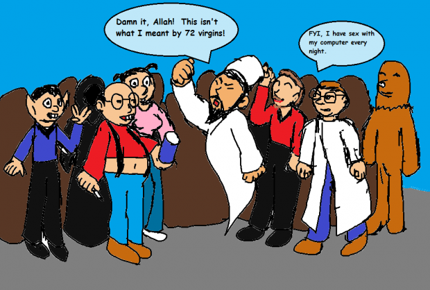 Nobody loves terrorists. These terrorists believe when they commit suicide bombing, they'll get 72 virgins as a reward. But whoever said the virgins would be sexy women? Here you've got the ghost of one of these terrorists among a group of super nerds. He should have been careful what he wished for in life, I guess. Still, beggars can't be choosers after all.