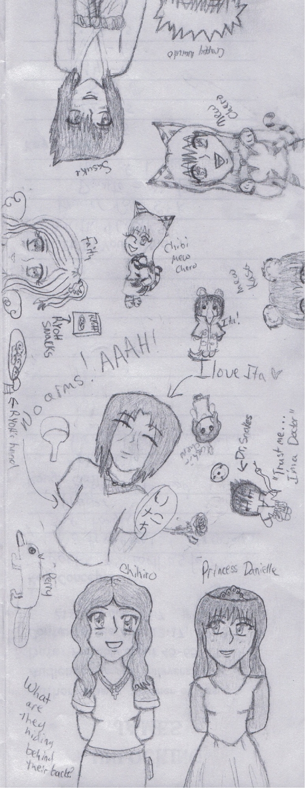 - Chero, Chihiro, Faith, Hime, Itachi, Kasa, Naruto, omg the Bible, Perry, Ryoh, Sasuke, why did I draw this