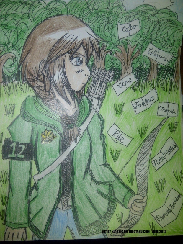 For the Mockingjay challenge, I drew Katniss exactly how I pictured her in the books. I sort of pictured her realistic but I also pictured her sort of like the Kingdom Hearts characters. I also wanted to try and draw Kingdom Hearts style. It's not exactly alike but that's ok if it isn't. This drawing took me a few weeks to draw. Actually the actual drawing took only a few days but it took me a few weeks to actually get around to coloring it. I finally finished coloring it today. I'm so happy with it. I love the Hunger Games books and I especially loved the movie. On the side I drew the tributes names to give it more interest and also to fill the space. I hope everyone enjoys the artwork. Dedicated to my best friend here on theO, MangaKid. Hope you like it friend. A higher quality picture will be submitted later. The drawing looks a lot better in real life. Sorry for bad quality. I took a picture of this from my phone.