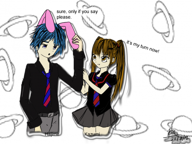 - black school uniforms, boy, brown hair, girl, ribbon, saturn, school life, skirt, tie, trouser, two ponytails