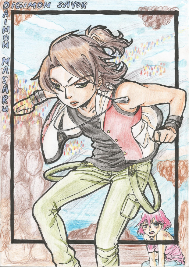 - boy, daimon, digimon, digiworld, flying islands, girl, hurt, masaru, serious face, spirit, yoshino