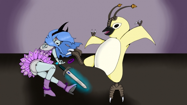 She look quite cute and thats way I choose the cute monster to fight her they seemed like the right match and as you see the chick is woopin' but. Also I'm no good at drawing evil looking things so these two matched my style most.