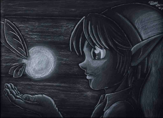 This is a fanart of Young Link and Navi from The Ocarina of Time when Navi finds Link after the Neku Tree dies. I tried playing with my charcoal pencils again.