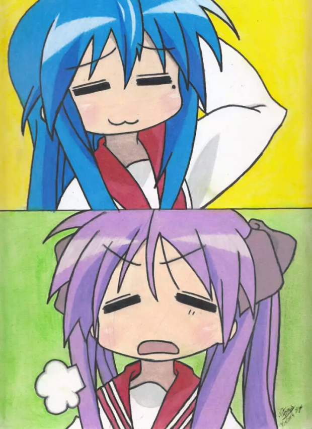 Konata and Kagami from Lucky Star everybody. I finally was able to color and upload it. Thankfully the scanners at the university library are bigger than what I have at home.
