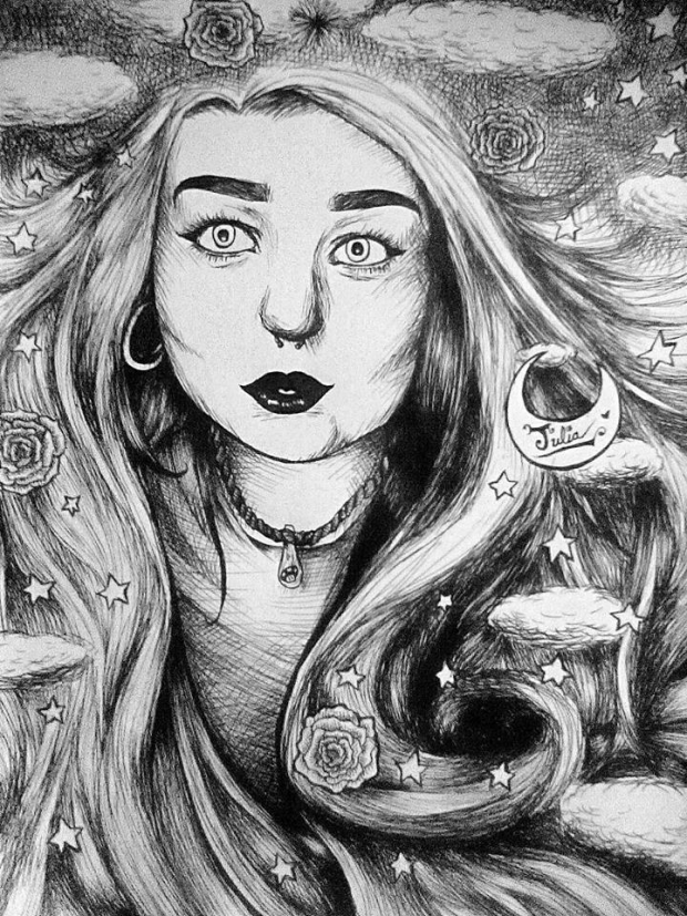 - blackandwhite, clestial, detail, face, friend, girl, ink, lady, moon, portrait, pretty, rose, stars