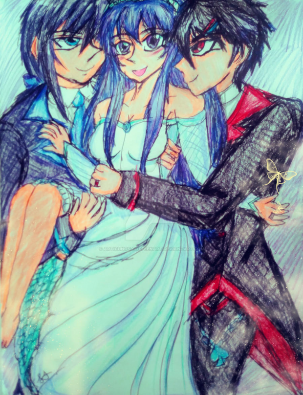 This drawing is a bit different from my usual stuff. Rika and the BLoody Twins from HnKnA are getting married. The twins both share their love for Rika, and if Rika only chose one, they'd gank each other. I had fun drawing this one even though it was challenging. Please enjoy the art. <3