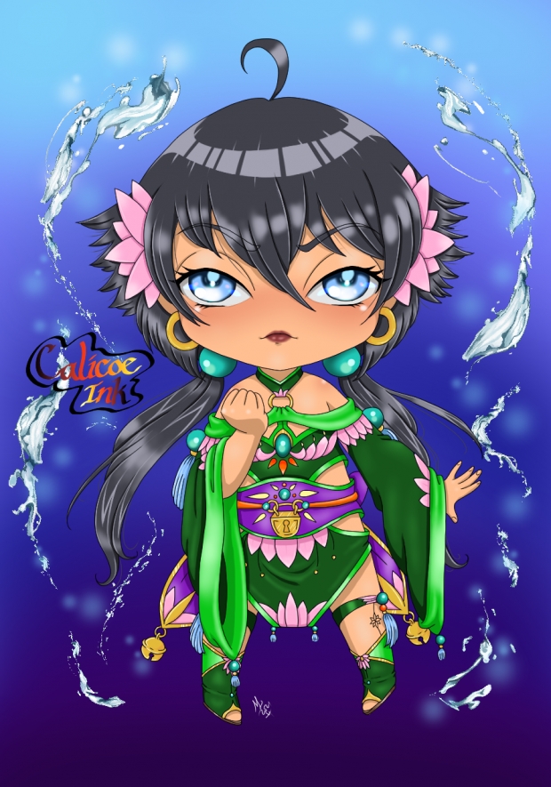 I decided to use my character Rin for day 7! She fits in a few spots, but I thought this was a good spot to use her. Rin is a water nymph who has an obvious affinity for water. She has a lot of attitude! Her clothes represent the water lillies that fill her shrine.