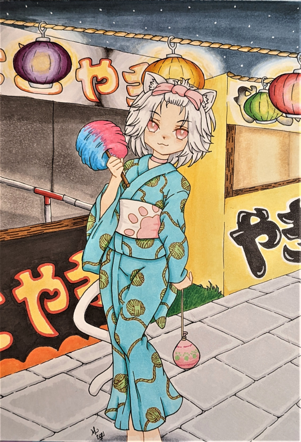 I'm not going to lie this took me a week and a half! It's all traditional art from pencil to alcohol based markers and it took me ages to get it right. I did this as a birthday present for a friend and will be sending them the hard copy soon! I have mentioned before that I am horrible at backgrounds and really they are my number one weakness so I was thrilled that this worked and I think I got it to look right! Wasabi enjoying a festival in her yukata and cotton candy. I even added the classic water balloon yoyo. (Currently experiencing that high of finishing a picture after putting in some serious effort!)