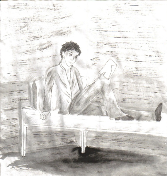 From RedViolin's novel, Fire & Ice. Commander Cease Lechatelierite in his bunk, reading a War report. Pencil and watercolors