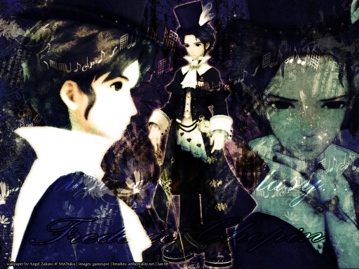 Ok, this took waaaaaaaay too long for what it's worth...sorry!! Doesn't look that great. ^^; This took a while because...I've never made a wallpaper with video game screen shots before! I'm not used to the style...I suppose you could say. I adore Eternal Sonata though, and I love Chopin. ^^ He's soooo cute!! Hehe. XD He certainly didn't look like that in real life (the composer). So yeah, to cover up the blurriness from the screens and whatnot...err, I used brushwork and overlays to create a grungy dark wallpaper! ^^;;; I got the pics from gamespot.com. They have lots of screen shots from video games. These were the best 3 I could find though...thus the birth of a collage type thing. ^^; It really took a while, and like I said...I don't think it's good enough! I doubt I'll get many downloads, but oh well. I hope someone likes it. I'm still pissed at the pic on the left...it was really blurry, so yeah. -__- Hope it cleaned up ok...argh. Just brushes and layers...blurs...overlays, PS textures, the usual. Color overlays, too...to make it the purple/green/blue you see there. It says "music & fantasy" and at the bottom "Frederic Chopin." I know, you can't read that, but I wanted the text there to make more texture, I guess. ^^; Though his name was more visible before...I changed it. Hope it's ok. Took probably an hour...don't remember cause I took a break, tried to draw Chopin, failed, had dinner, and then returned! Well, I hope you like it!