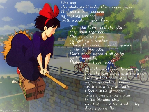 this is such a great movie, I find it inspiring, personally. And the songs my Sydney Forest in this movie are really great to listen to. this is the closing song, part of the closing song to Kiki's Delivery Service, which my friend and I are obbessed with, heehee.