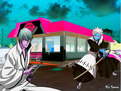 LOLZ. thats all i have to say...well anyways this is my entry for 21Emmz12's The Final Countdown Challenge. I think i got the random right lolz Oh i made a story for it too so its not too confusing!! Okok so Toshiro goes to his favorite spot,Dairy Queen and gets a blizzard! Gin then comes in and smacks Torshiros blizzard to the ground! Toshiro gets angry and BAm!!Fight! Heres the background http://www.tavernierdq.com/DairyQueenBldg.JPG
