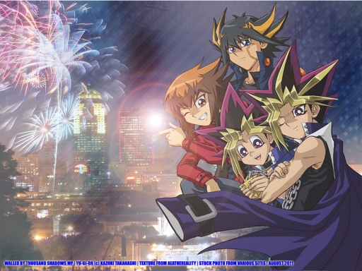 I love Yu-Gi-Oh and I have been a fan of it since elementary school. It is one of the best animes ever in my opinion. I love the characters and I love the stories and the action. I love the artwork for the characters and all the monsters. I am always amazed at how the main characters find a way to win when the odds are against them. That said, I really love Yu-Gi-Oh and I can't believe it's been 10 years since it was first made. It's really amazing. This wallpaper was made to celebrate Yu-Gi-Oh's 10th anniversary. Also I love all the main characters in the Yu-Gi-Oh series. I think Yusei,Yugi,Atem,and Jaden are some of the best characters around.