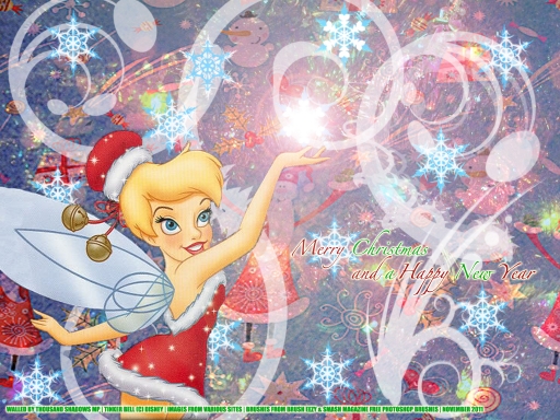 I can't believe that Christmas is almost around the corner. I know it isn't December yet but it's getting close. Next week is Thanksgiving and everyone will be sitting at the table with their families eating a delicious turkey along with all the fixings to go with it. It makes me hungry just thinking about it. Anyway I can't believe how close Christmas is getting. They're already advertising for Christmas like crazy on TV. They try to make it all about the gifts and it isn't that way. It's about spending time with family and being thankful for what you have. Well that's Thanksgiving but it still applies to Christmas too. I love Christmas because it's such a wonderful time of year. I love seeing all the Christmas decorations everywhere and I can't wait to put up my own Christmas tree. I'm waiting to put it up after Thanksgiving. That's a good time to put up your Christmas tree but everybody has their preferences. But anyway this wallpaper features Tinkerbell dressed up for Christmas. Usually I make a widescreen wallpaper but the image quality wasn't good enough to really make one so I just made a 1024x768 wallpaper. I usually try to find high quality images but it isn't always easy. I did the best I could with the image but I like how it turned out. I also used some swirl brushes to kind of give it more of a winter feel. I also found some cute snowflake brushes and added those in too. I really like how it turned out. I think Tinkerbell is really cool and she's one of my favorite Disney charaters. Dedicated to HarvestMoonLuvr