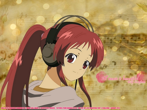 - anime girl, flowers, headphones, music, red hair