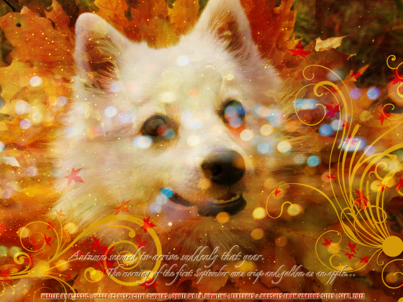 Here's another autumn wallpaper I made featuring the most adorable puppy. The puppy has a collar of leaves around its neck and it is just so cute. I just had to make a wallpaper with it. It's pretty simple with some textures and some brushes. I'm really happy with how it turned out. I love autumn and I think it is just one of the most beautiful times of year. I hope everyone enjoys the wallpaper. I have to dedicate this wallpaper to ItachiSaskuke for dedicating such a lovely card to me. Thank you ItachiSasuke for the lovely card. I hope you like the wallpaper. Thank you for being so nice!